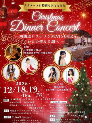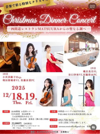 ■クリスマスランチ・ディナーのご案内 12月23(金)日から25日(日)まで、クリスマス特別コースをご用意させていただきます。三河鮑、オマール海老、フカヒレ、和牛フィレ肉などの豪華フルコースをご用意いたします。 ■クリスマスディナー 20000円(税込) ①18時スタート ②19時スタート ③20時30分スタート ■クリスマスランチ 10000円(税込) お席に限りがございます、ご予約はお早めに。 四間道レストランMATSUURA お問い合わせ・ご予約:052-720-5631 ※サービス料別途頂戴いたします。 ※ご予約のキャンセル・人数の変更は1週間前とさせていただきます。 |